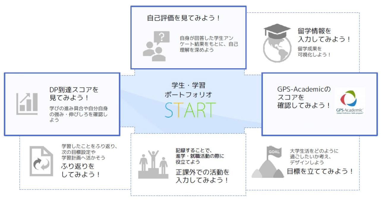 本学は2024年度に「学生・学習ポートフォリオ」を導入しました。これは、学生が自身の成績や学修状況、DP到達スコアを、パソコンやスマホから確認できるシステムです。学生自身が留学や課外活動の記録、英語検定試験のスコアを入力することもできます。